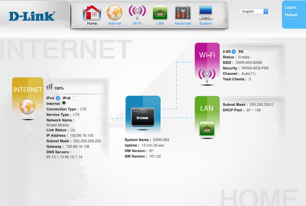 برای راه اندازی اولیه روتر DWR-953 کافی است آنتن های جداشونده را به پشت بدنه متصل کنید، آداپتور را به برق بزنید و یک سیم کارت فعال را داخل شیار مربوطه قرار دهید. به همین راحتی هرجا سیگنال مخابراتی وجود داشته باشد اینترنت همراه شما خواهد بود. اما برای دسترسی به تنظیمات دستگاه یا ایجاد تغییرات باید به کنترل پنل ادمین مراجعه کنید. آی پی که زیر روتر نوشته شده را داخل مرورگر وارد کنید تا کنترل پنل و منوی تنظیمات دستگاه ظاهر شوند.