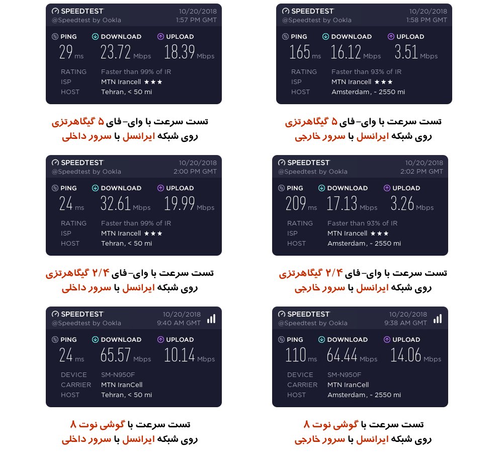 در شبکه همراه اول وقتی روی باند ۲/۴ گیگاهرتزی به وای-فای متصل هستیم سرعت اتصال از حدود ۲۰ مگابیت در ثانیه بالاتر نمی رود. روی باند ۵ گیگاهرتزی سرعت کمی بالاتر از ۳۰ مگابایت نیز قابل دستیابی است، اما برای رسیدن به سرعت بالاتر باید از ابزاری کمک بگیرید که چیپ مخابراتی پیشرفته تری داشته باشد، مثلاً گوشی نوت ۸ (بررسی مجله ای سی بلاگ) که از استاندارد CAT16 پشتیبانی می کند و سرعت اتصالش در همین نقطه به خدود ۴۰ مگابیت در ثانیه می رسد.