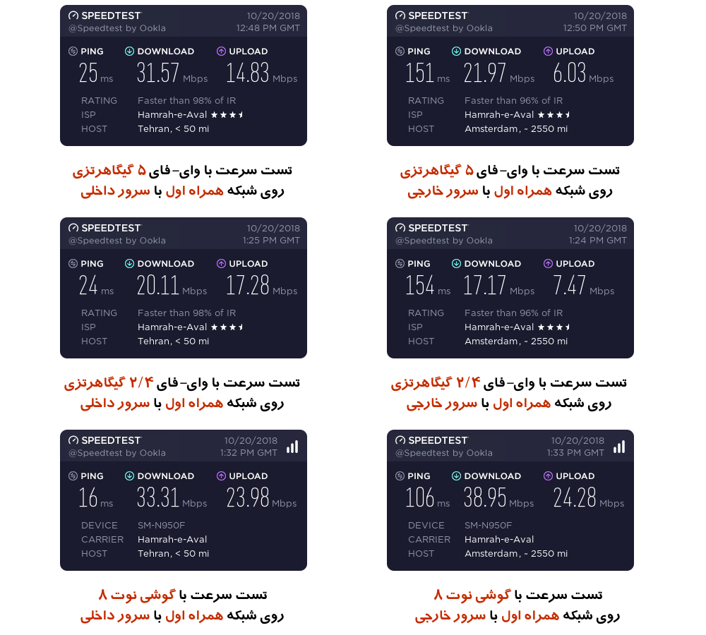 در شبکه همراه اول وقتی روی باند ۲/۴ گیگاهرتزی به وای-فای متصل هستیم سرعت اتصال از حدود ۲۰ مگابیت در ثانیه بالاتر نمی رود. روی باند ۵ گیگاهرتزی سرعت کمی بالاتر از ۳۰ مگابایت نیز قابل دستیابی است، اما برای رسیدن به سرعت بالاتر باید از ابزاری کمک بگیرید که چیپ مخابراتی پیشرفته تری داشته باشد، مثلاً گوشی نوت ۸ (بررسی مجله ای سی بلاگ) که از استاندارد CAT16 پشتیبانی می کند و سرعت اتصالش در همین نقطه به خدود ۴۰ مگابیت در ثانیه می رسد.